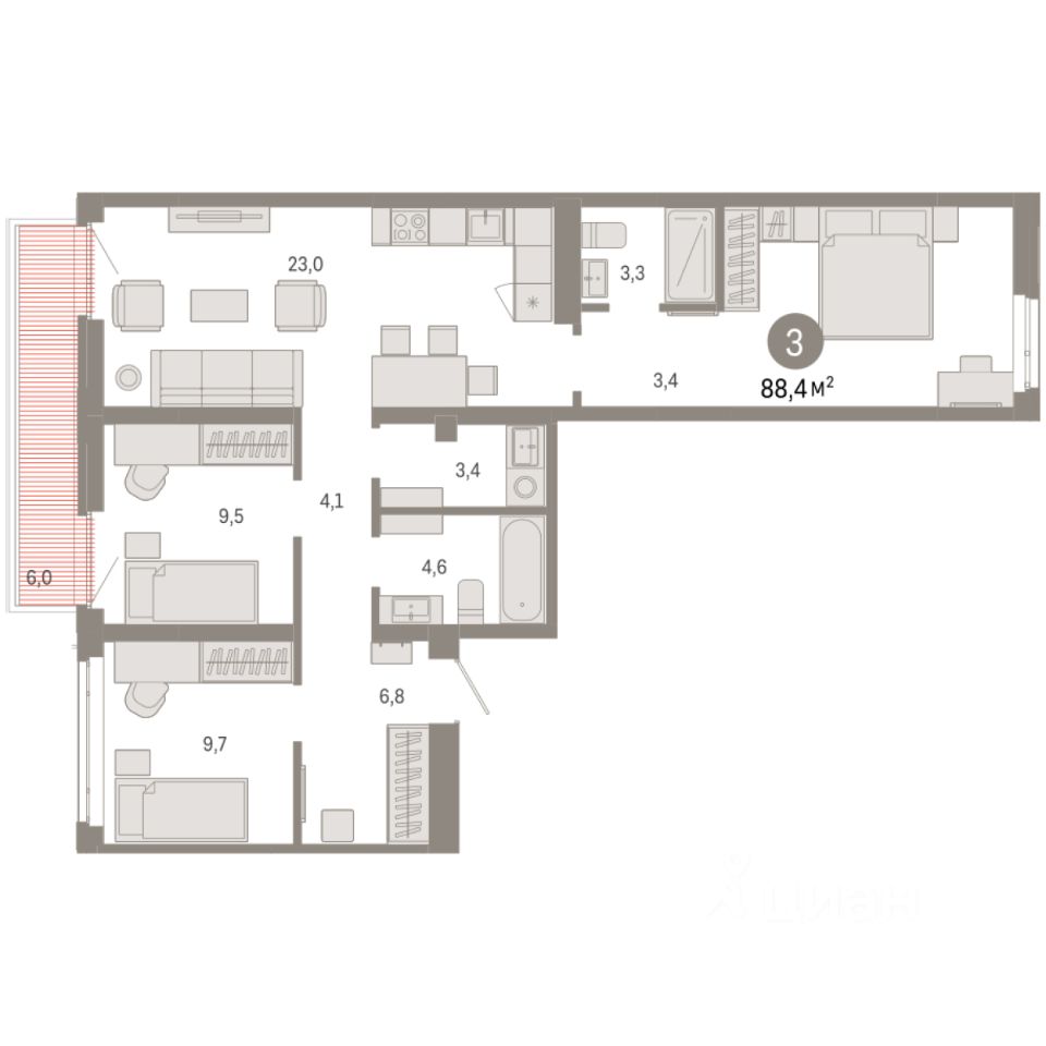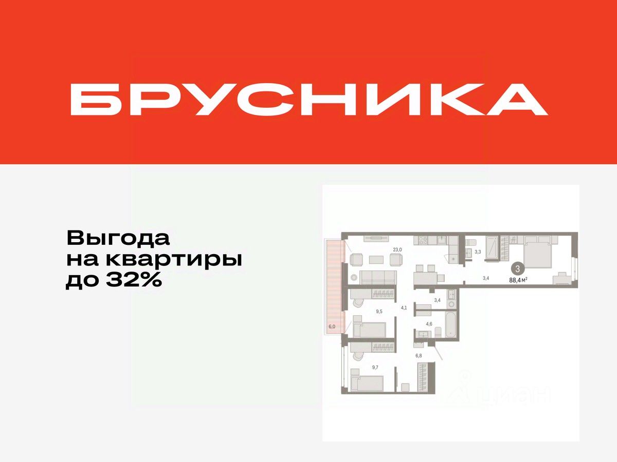 Продается 3-комн. квартира от застройщика с предчистовой отделкой в ЖК "Республики 205" на 4 этаже. Общая площадь: 88.35 кв.м., жилая: 33.2 кв.м., площадь просторной кухни-гостиной: 23 кв.м. Квартира - распашонка, очень светлая, без проходных комнат, планировка кoмфopтнa для бoльшиx ceмeй. В квартире два балкона, два совмещенных санузла. Высота потолков 2.7 м.