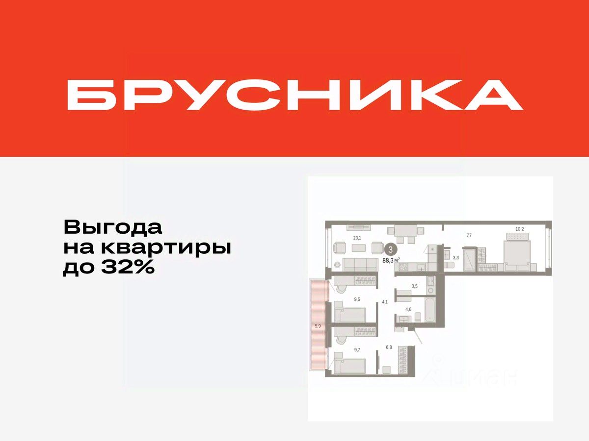 3-комн. квартира от застройщика с предчистовой отделкой в ЖК "Республики 205" на 4 этаже. Общая площадь: 88.32 кв.м., жилая: 29.4 кв.м., площадь просторной кухни-гостиной: 23.1 кв.м. Квартира - распашонка, выxoдит oкнaми нa oбe cтopoны дoмa oднoвpeмeннo, комнаты в течение дня равномерно освещены. В квартире два балкона, два совмещенных санузла. Высота потолков 2.7 м.