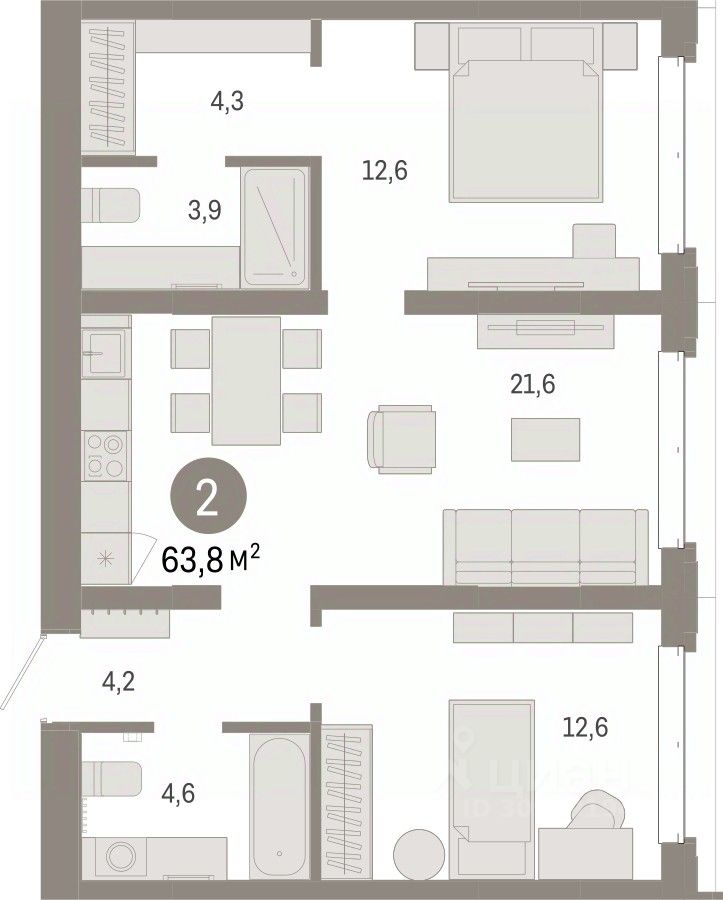 Квартира с кухней-гостиной и двумя спальнями в кварталах "На Минской". Особенности планировки: гардеробная, вид во двор, разнесённые спальни, предчистовая отделка, мастер-спальня.