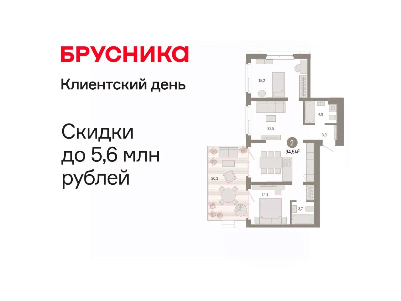 Квартира с кухней-гостиной и двумя спальнями в кварталах "На Минской". Особенности планировки: вид во двор, мастер-спальня, окна в пол, панорамное остекление, предчистовая отделка, разнесённые спальни, терраса.