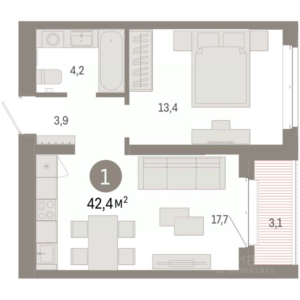 1-комн. квартира с предчистовой отделкой в Кварталы "На Минской" на 4 этаже. Общая площадь: 42.38 кв.м., жилая: 13.4 кв.м., площадь просторной кухни-гостиной: 17.7 кв.м. Все окна выходят на одну сторону. В квартире одна лоджия, один совмещенный санузел. Высота потолков 2.7 м.