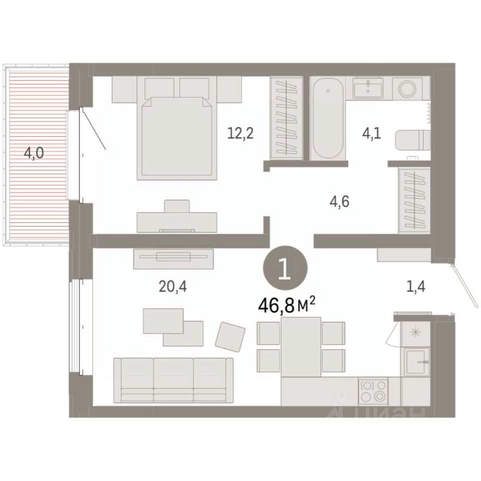 1-комн. квартира с предчистовой отделкой в Кварталы "На Минской" на 4 этаже. Общая площадь: 46.76 кв.м., жилая: 12.2 кв.м., площадь просторной кухни-гостиной: 20.4 кв.м. Все окна выходят на одну сторону. В квартире один балкон, один совмещенный санузел. Высота потолков 2.7 м.