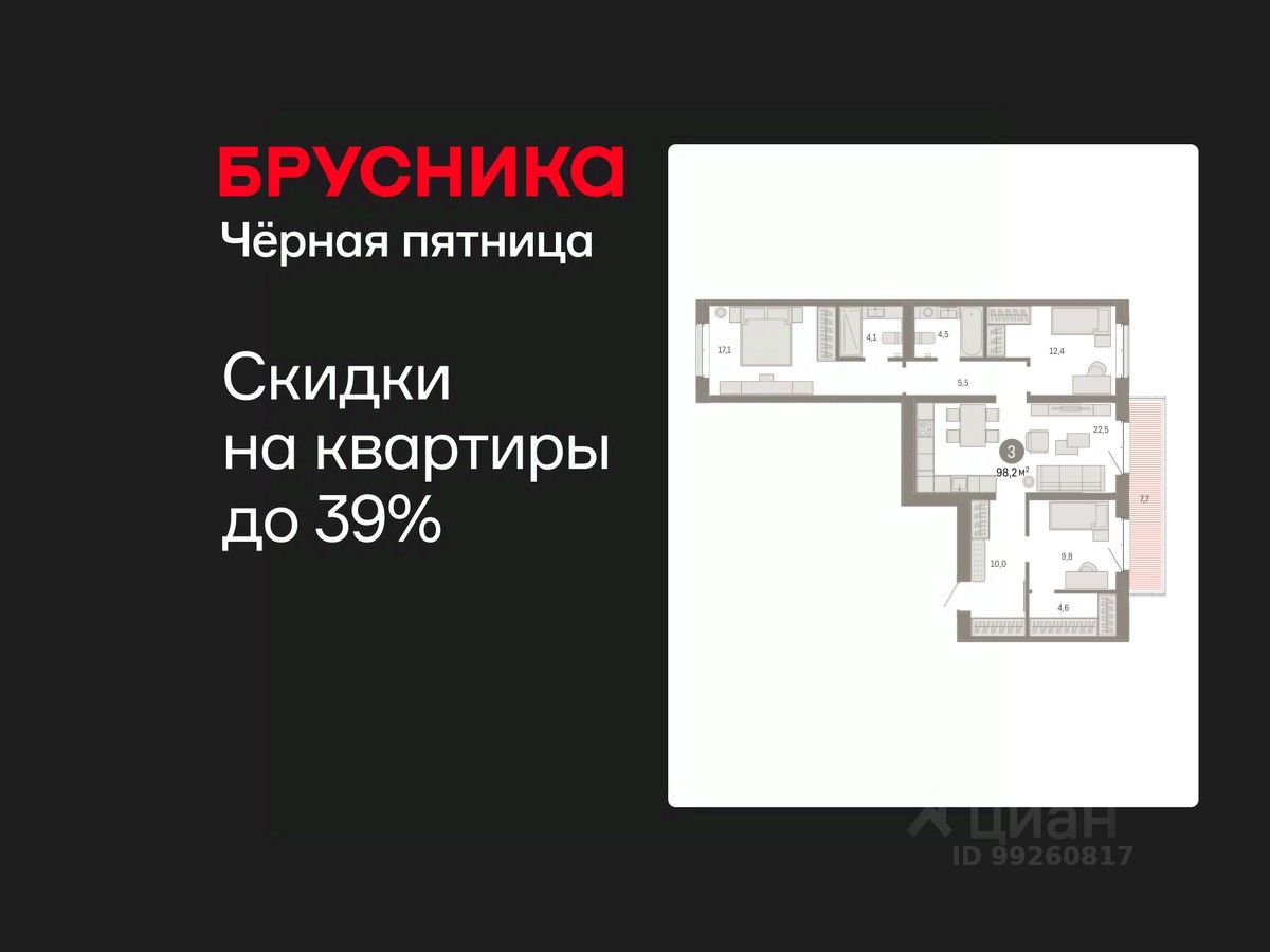 Трехкомнатная квартира с предчистовой отделкой в Кварталы "На Минской" на 4 этаже. Общая площадь: 98.17 кв.м., жилая: 39.3 кв.м., площадь просторной кухни-гостиной: 22.5 кв.м. Квартира - распашонка, без проходных комнат, окна выходят на paзные стороны дома. В квартире один балкон, два совмещенных санузла. Высота потолков 2.7 м.