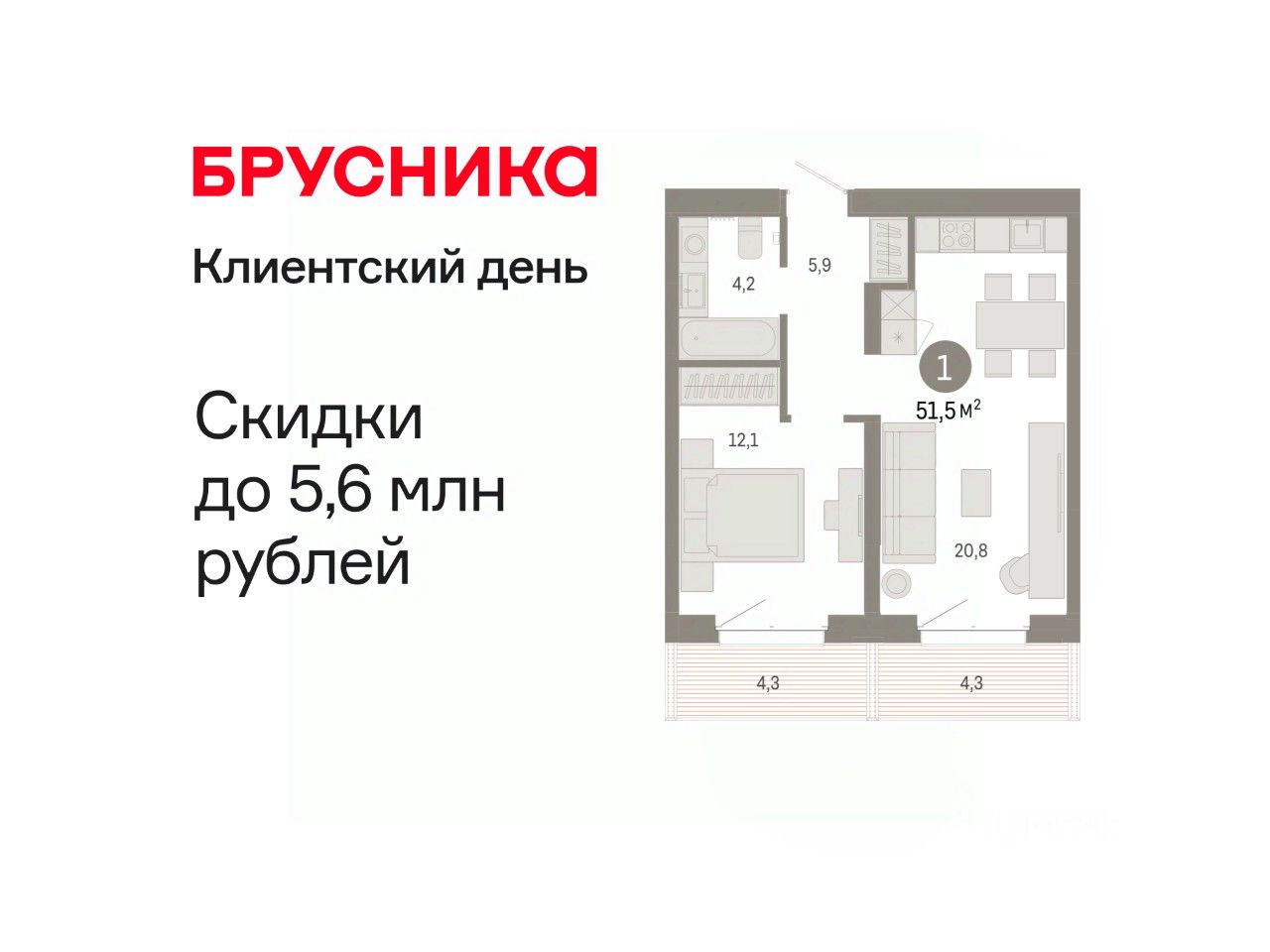 Квартира с кухней-гостиной и одной спальней в кварталах "На Минской". Особенности планировки: предчистовая отделка.