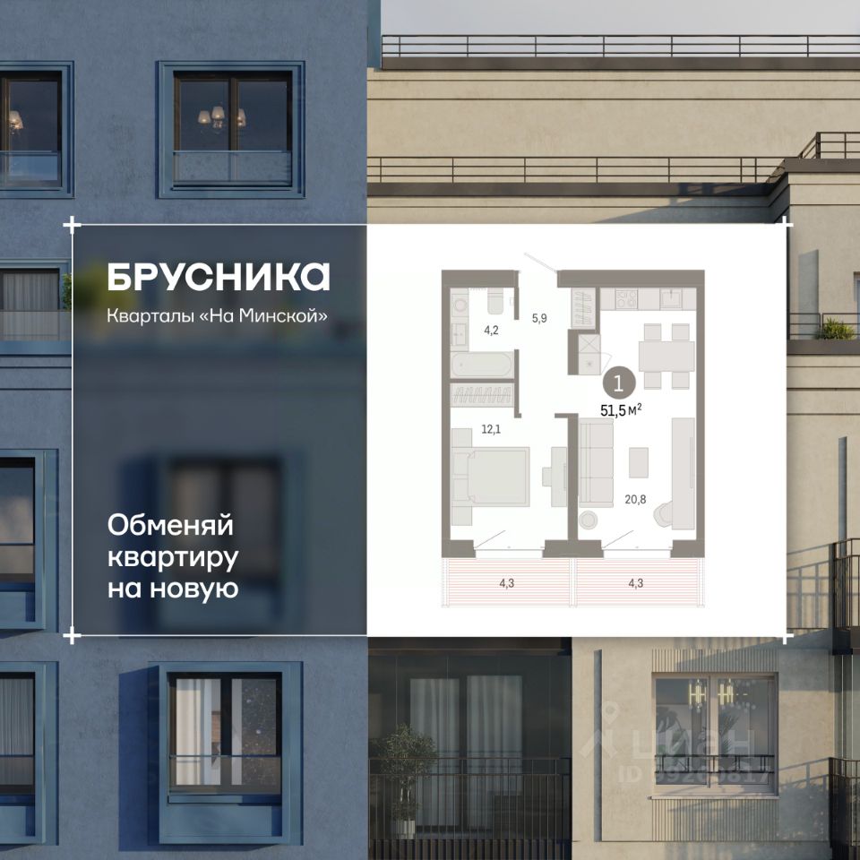1-комн. квартира с предчистовой отделкой в Кварталы "На Минской" на 6 этаже. Общая площадь: 51.48 кв.м., жилая: 12.1 кв.м., площадь просторной кухни-гостиной: 20.8 кв.м. Все окна выходят на одну сторону. В квартире два балкона, один совмещенный санузел. Высота потолков 2.7 м.