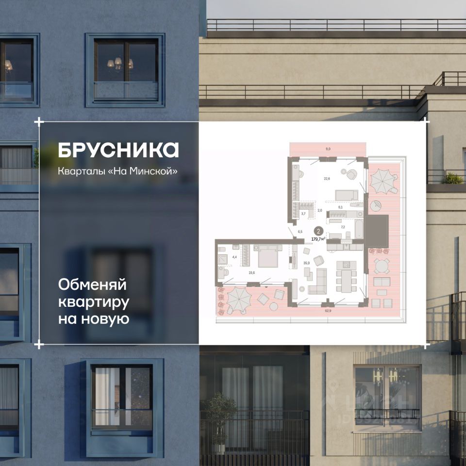 2-комн. квартира от застройщика с предчистовой отделкой в Кварталы "На Минской" на 7 этаже. Общая площадь: 179.74 кв.м. Высота потолков 2.7 м.