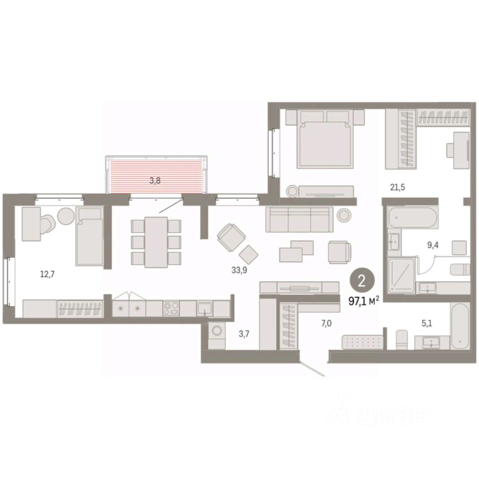 2-комн. квартира от застройщика с предчистовой отделкой в Кварталы "На Минской" на 5 этаже. Общая площадь: 97.13 кв.м., жилая: 34.2 кв.м., площадь просторной кухни-гостиной: 33.9 кв.м. Квартира угловая, идеально подойдет любителям тишины и панорамных видов. В квартире один балкон, два совмещенных санузла. Высота потолков 2.7 м.