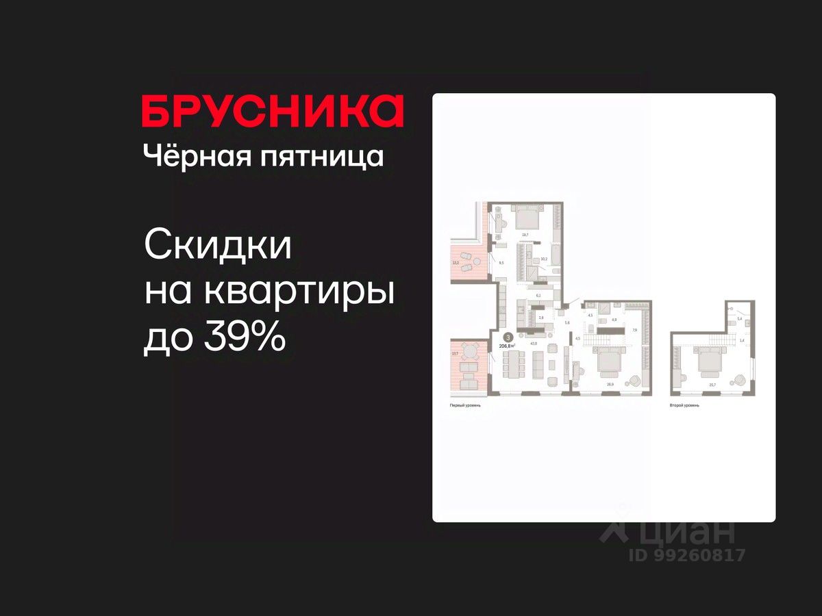 Двухуровневая квартира с кухней-гостиной и тремя спальнями в кварталах "На Минской". Особенности планировки: второй санузел, гардеробная, окна в пол, двухуровневая, вид во двор, панорамное остекление, разнесённые спальни, предчистовая отделка, мастер-спальня, терраса на крыше.