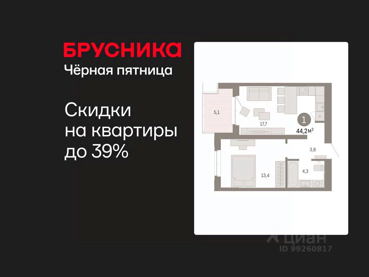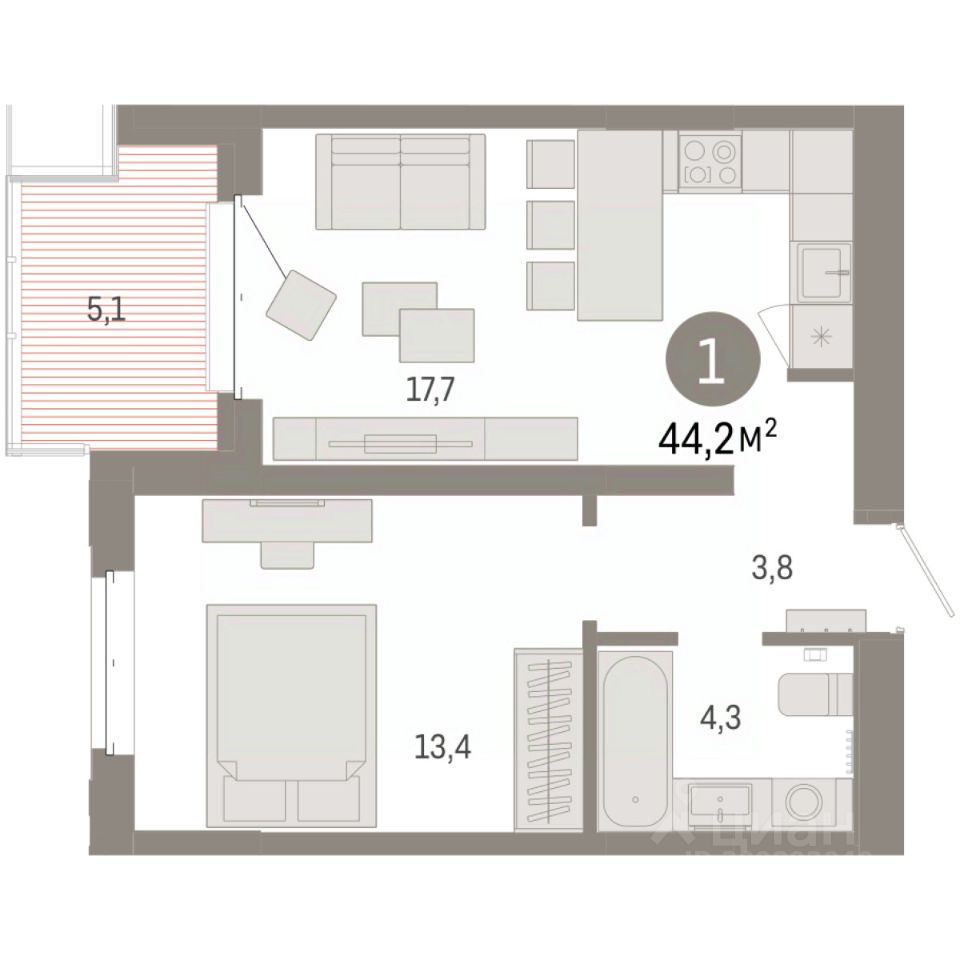 Однокомнатная квартира от застройщика с предчистовой отделкой в Кварталы "На Минской" на 4 этаже. Общая площадь: 44.22 кв.м., жилая: 13.4 кв.м., площадь просторной кухни-гостиной: 17.7 кв.м. Все окна выходят на одну сторону. В квартире одна лоджия, один совмещенный санузел. Высота потолков 2.7 м.