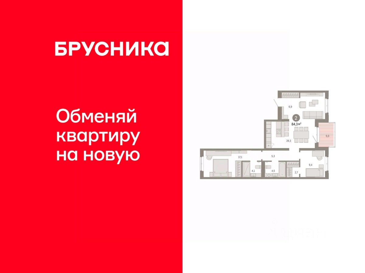 Квартира с кухней-гостиной и двумя спальнями в кварталах "На Минской". Особенности планировки: балкон, вид во двор, гардеробная, мастер-спальня, окна на две стороны, предчистовая отделка, разнесённые спальни.