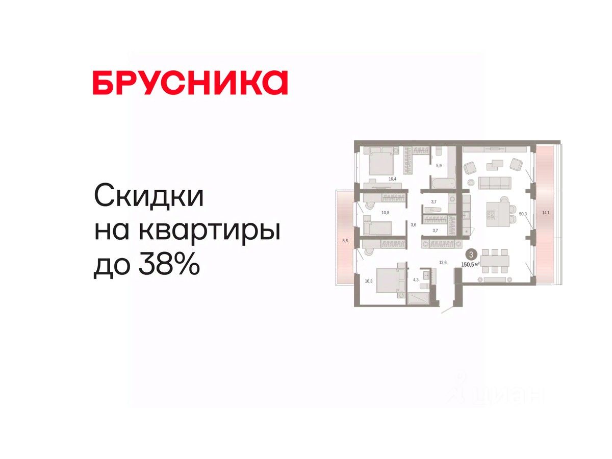 Квартира с кухней-гостиной и тремя спальнями в кварталах "На Минской". Особенности планировки: балкон, вид во двор, гардеробная, мастер-спальня, постирочная, предчистовая отделка, терраса на крыше.