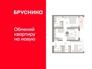 2-комн. квартира от застройщика с предчистовой отделкой в Кварталы "На Минской" на 4 этаже. Общая площадь: 70.33 кв.м., жилая: 23.9 кв.м., площадь просторной кухни-гостиной: 20.8 кв.м. Комнаты изолированные, все окна выходят на одну сторону. В квартире один балкон, два совмещенных санузла. Высота потолков 2.7 м.