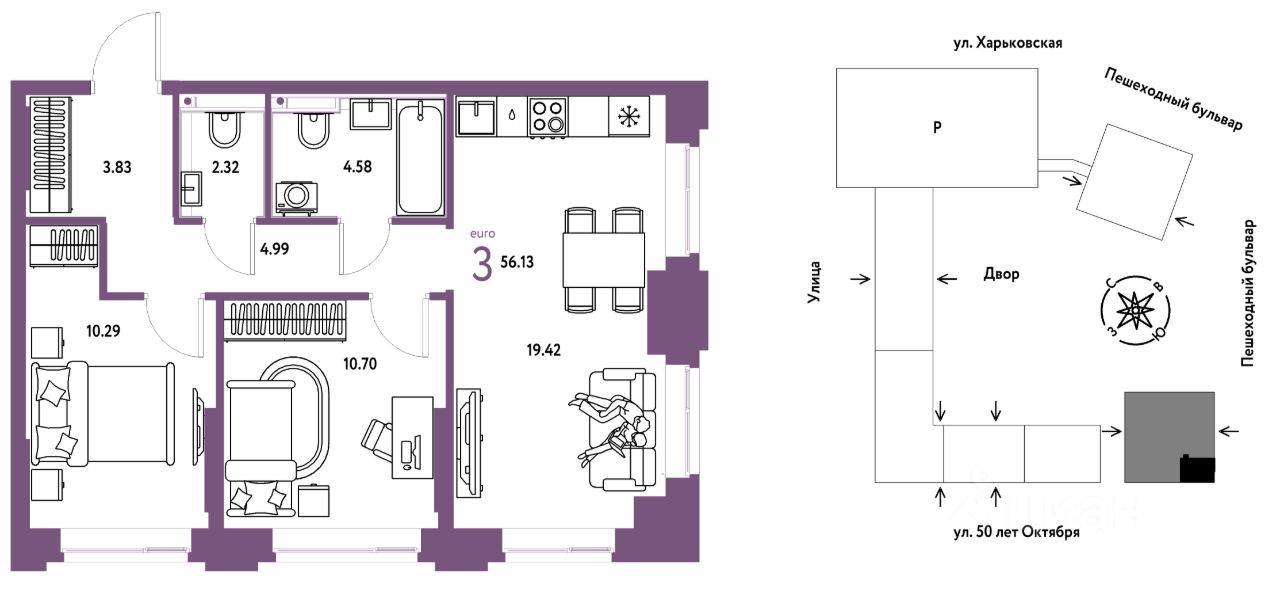 Продается 3комнатная квартира на 2 этаже от застройщика Страна Девелопмент. Площадь квартиры 56,13 кв. м.