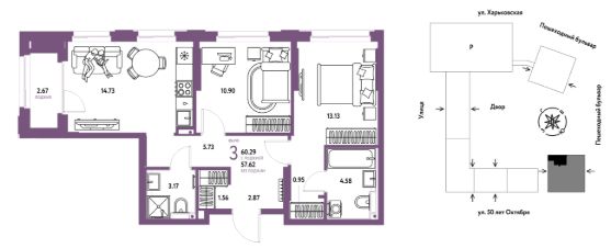 Продается 3комнатная квартира на 6 этаже от застройщика Страна Девелопмент. Площадь квартиры 60,29 кв. м.