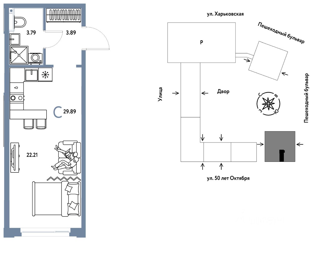 Продается 1комнатная квартира на 9 этаже от застройщика Страна Девелопмент. Площадь квартиры 29,89 кв. м.