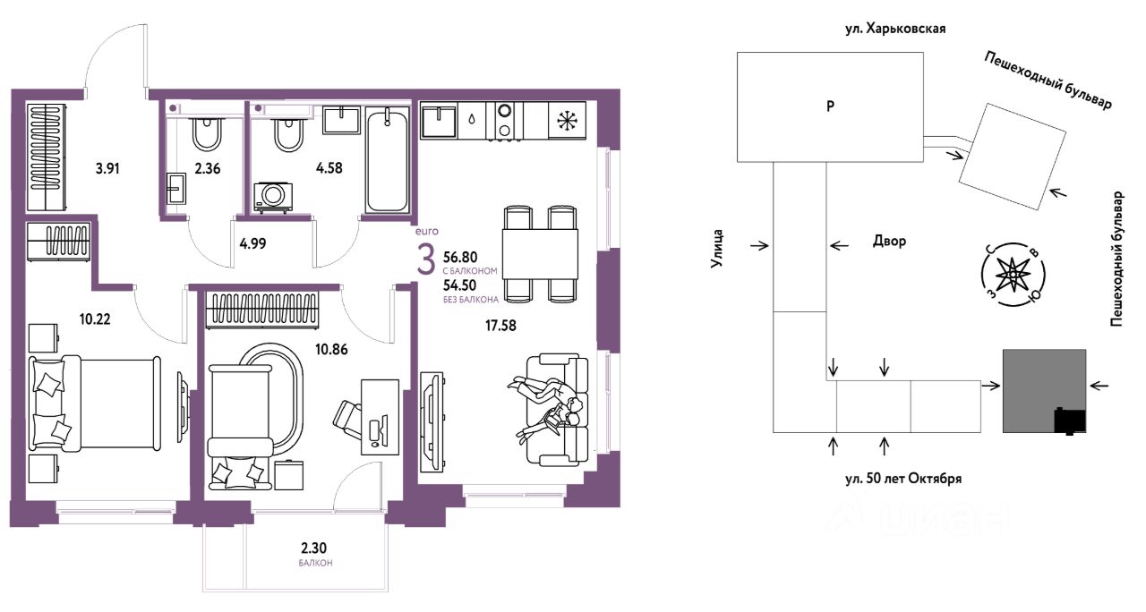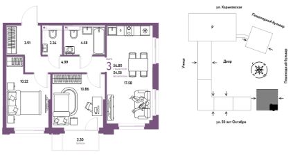 Продается 3комнатная квартира на 13 этаже от застройщика Страна Девелопмент. Площадь квартиры 56,8 кв. м.