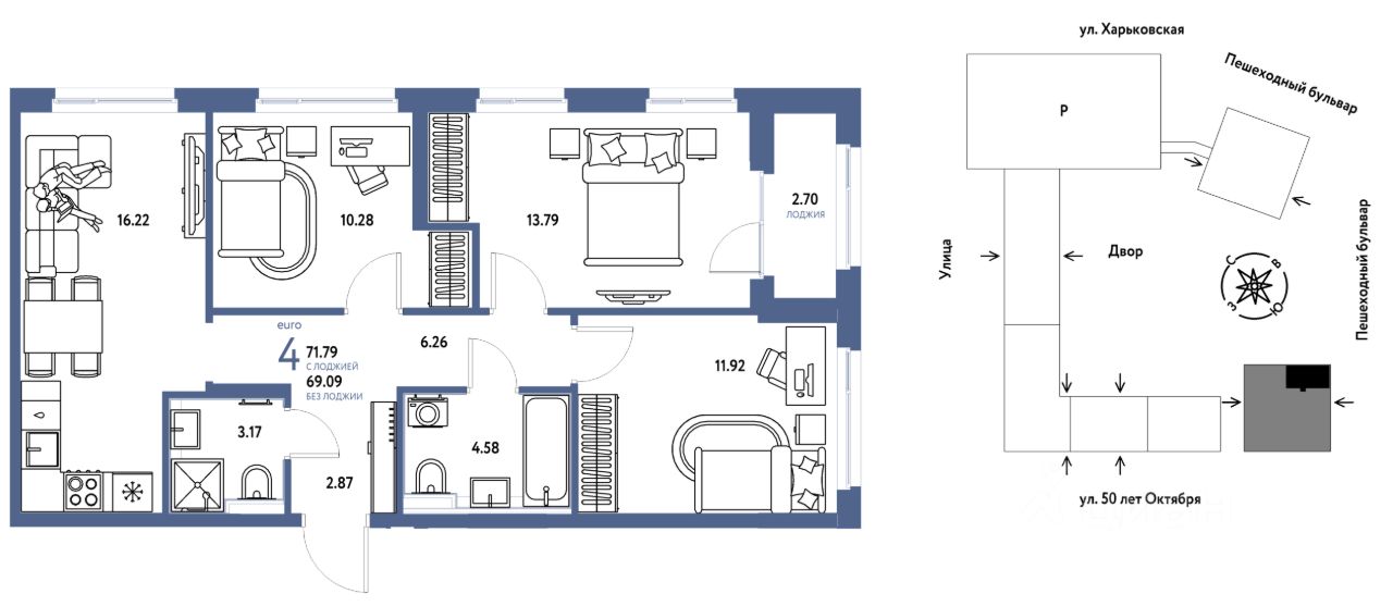 Продается 4комнатная квартира на 20 этаже от застройщика Страна Девелопмент. Площадь квартиры 71,79 кв. м.