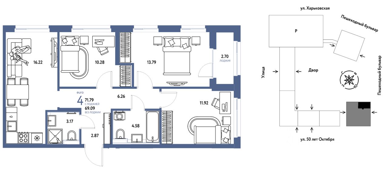 Продается 4комнатная квартира на 21 этаже от застройщика Страна Девелопмент. Площадь квартиры 71,79 кв. м.