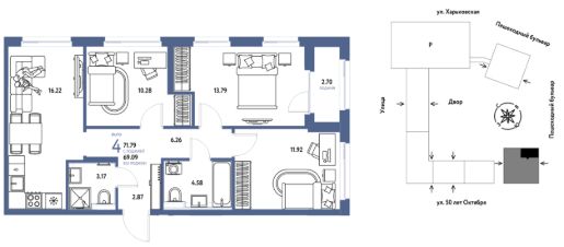 - Основная идея благоустройства дворов — создание камерного, уютного пространства. Периметры кварталов образуют закрытые контуры, внутри которых расположились тихие дворы с местами для отдыха, игровыми и релакс-зонами. Благодаря сквозным парадным во дворе нет машин. Защита от посторонних, служба охраны и видеонаблюдение 24/7 — гарантия безопасности вашей семьи.