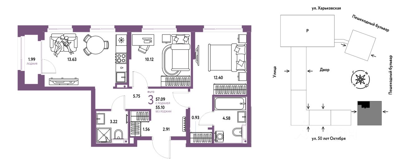Продается 3комнатная квартира на 21 этаже от застройщика Страна Девелопмент. Площадь квартиры 57,09 кв. м.
