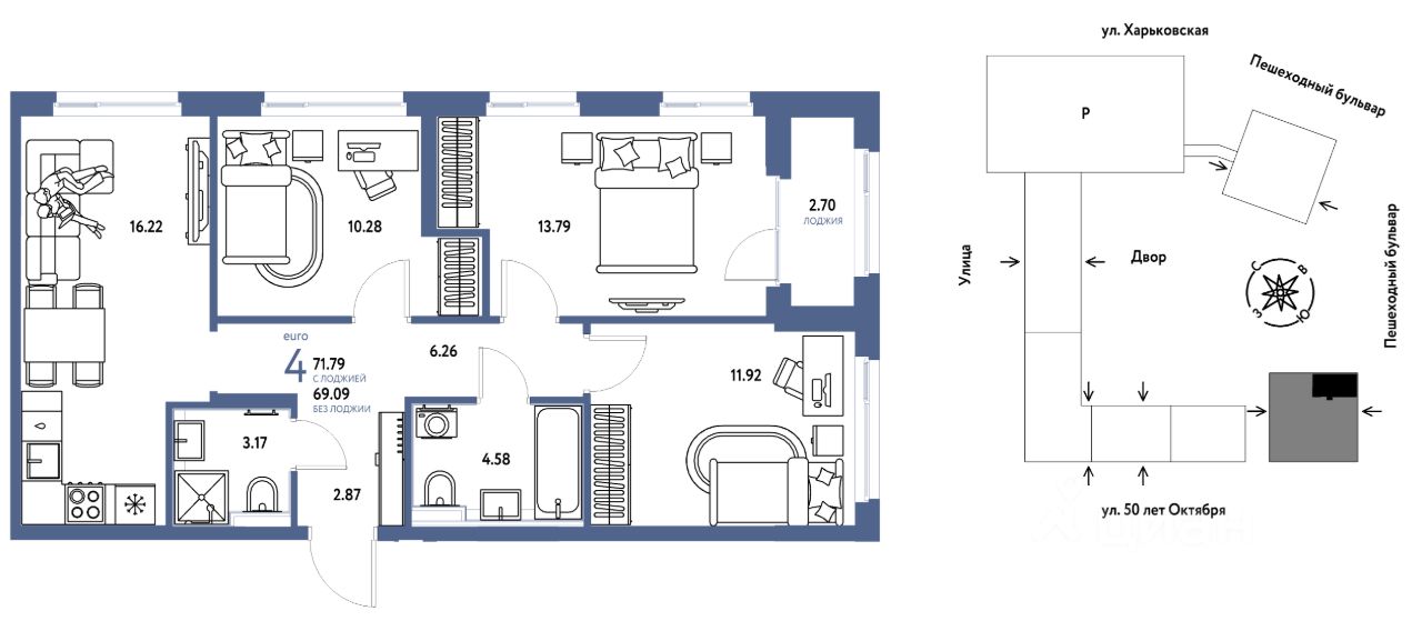 Продается 4комнатная квартира на 22 этаже от застройщика Страна Девелопмент. Площадь квартиры 71,79 кв. м.