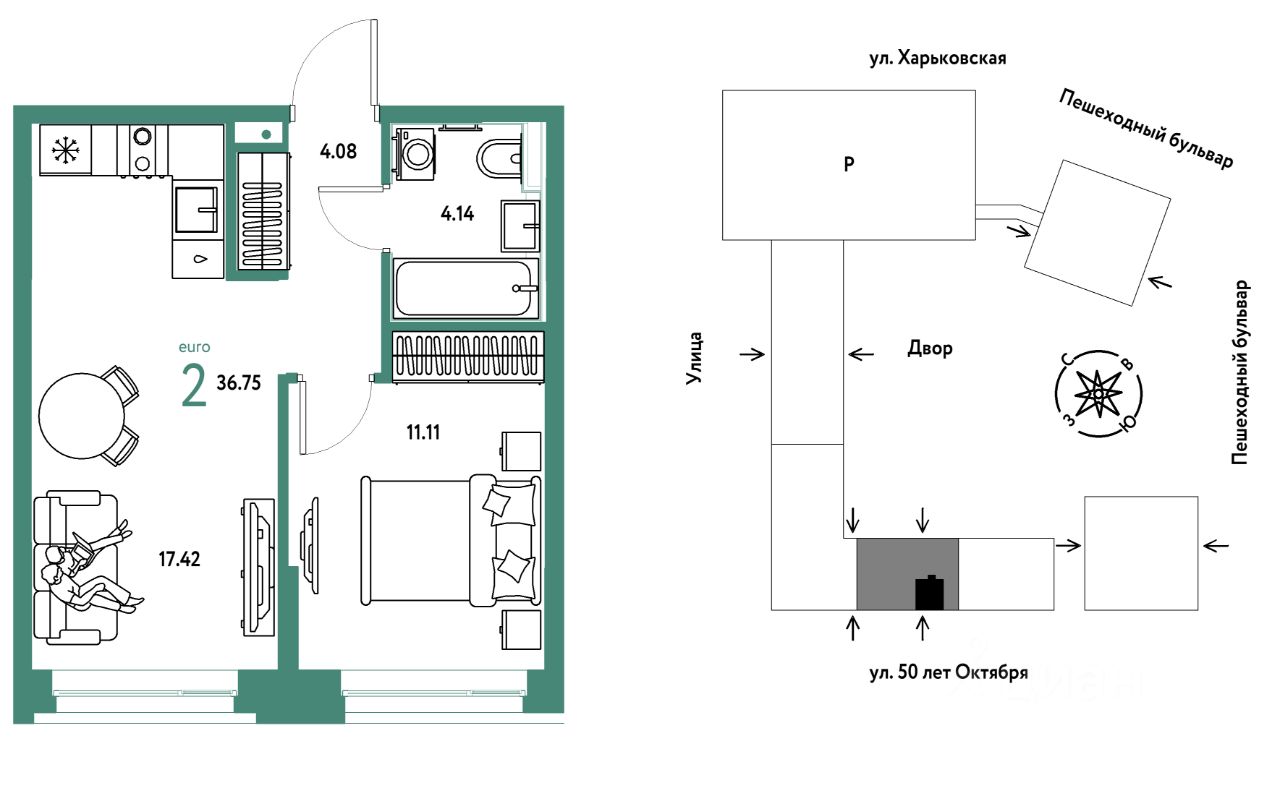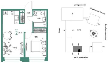 Продается 2комнатная квартира на 4 этаже от застройщика Страна Девелопмент. Площадь квартиры 36,75 кв. м.