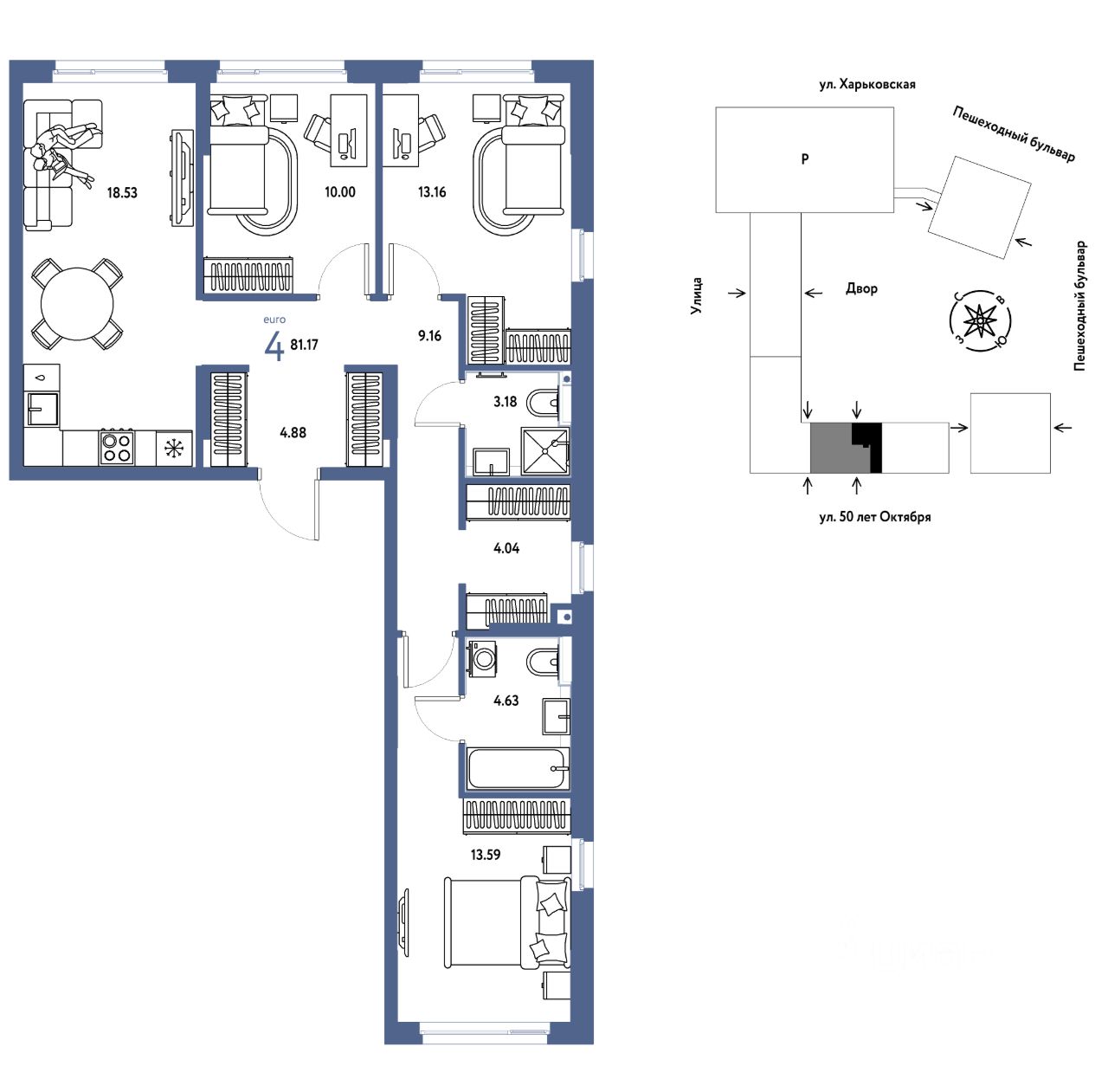 Продается 4комнатная квартира на 6 этаже от застройщика Страна Девелопмент. Площадь квартиры 81,17 кв. м.