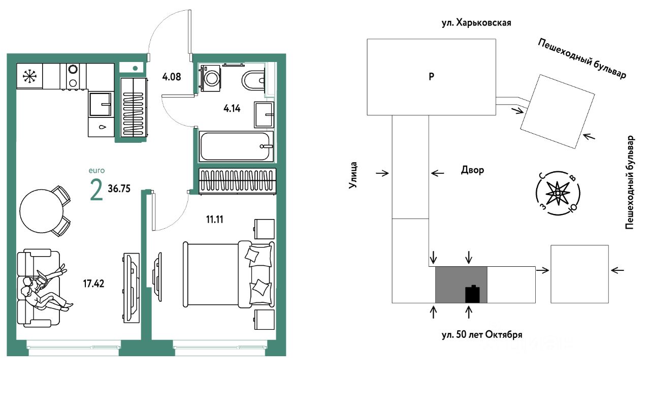 Продается 2комнатная квартира на 6 этаже от застройщика Страна Девелопмент. Площадь квартиры 36,75 кв. м.