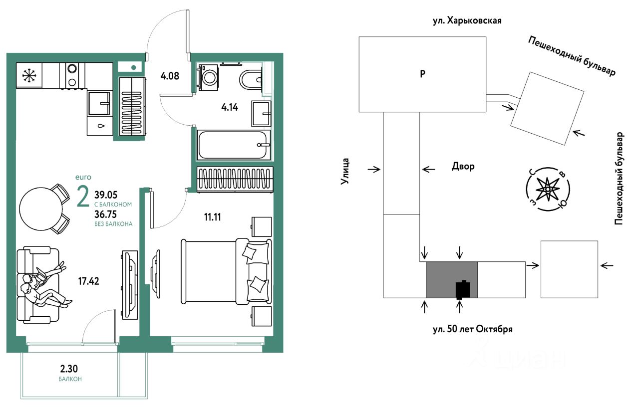 Продается 2комнатная квартира на 8 этаже от застройщика Страна Девелопмент. Площадь квартиры 39,05 кв. м.