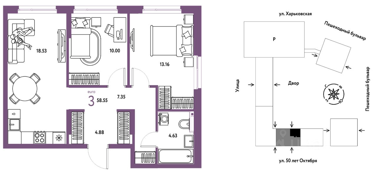 Продается 3комнатная квартира на 12 этаже от застройщика Страна Девелопмент. Площадь квартиры 58,55 кв. м.
