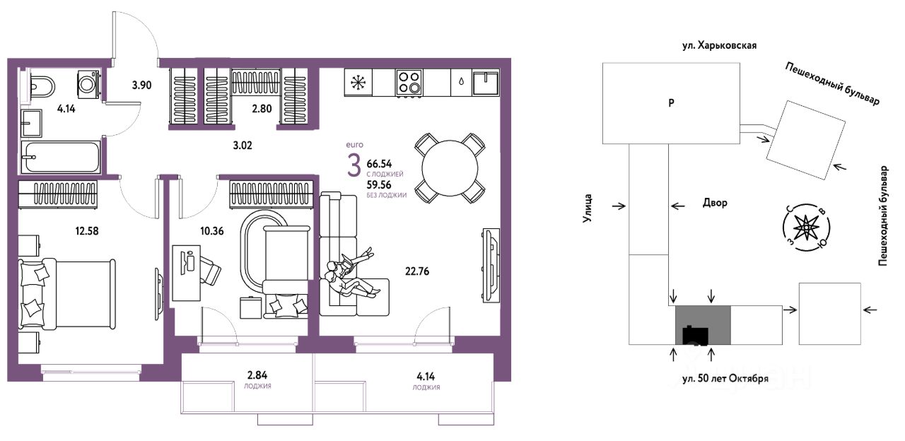 Продается 3комнатная квартира на 13 этаже от застройщика Страна Девелопмент. Площадь квартиры 66,54 кв. м.