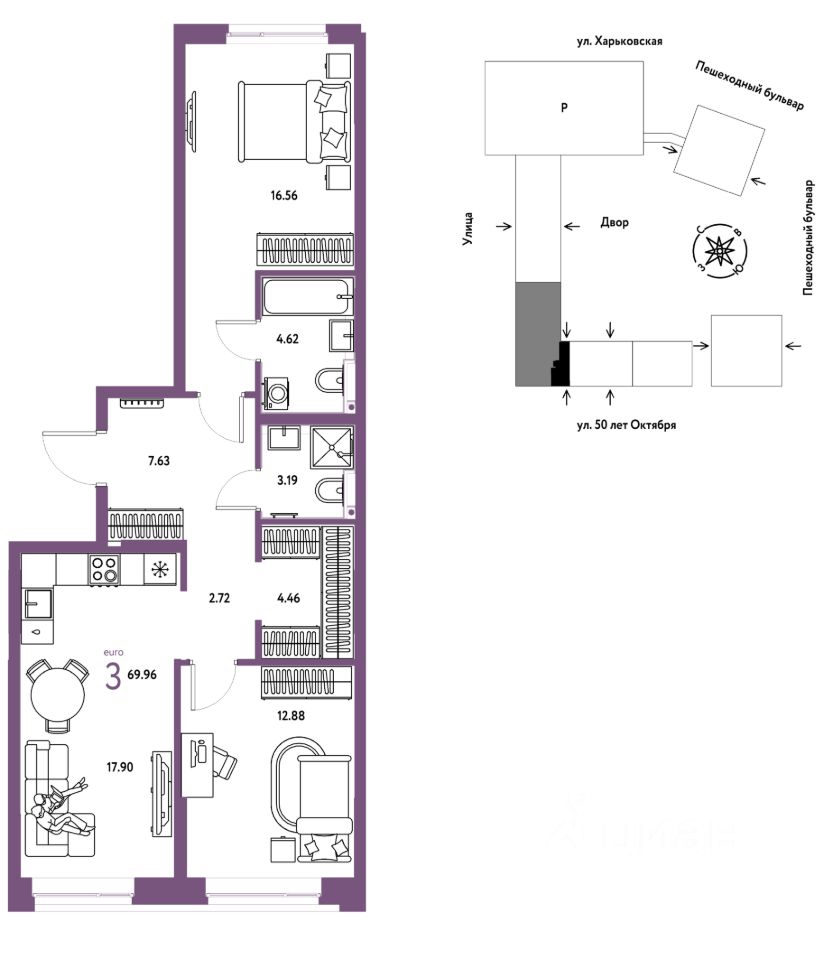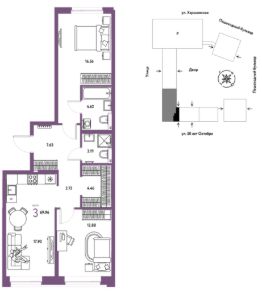 Продается 3комнатная квартира на 3 этаже от застройщика Страна Девелопмент. Площадь квартиры 69,96 кв. м.
