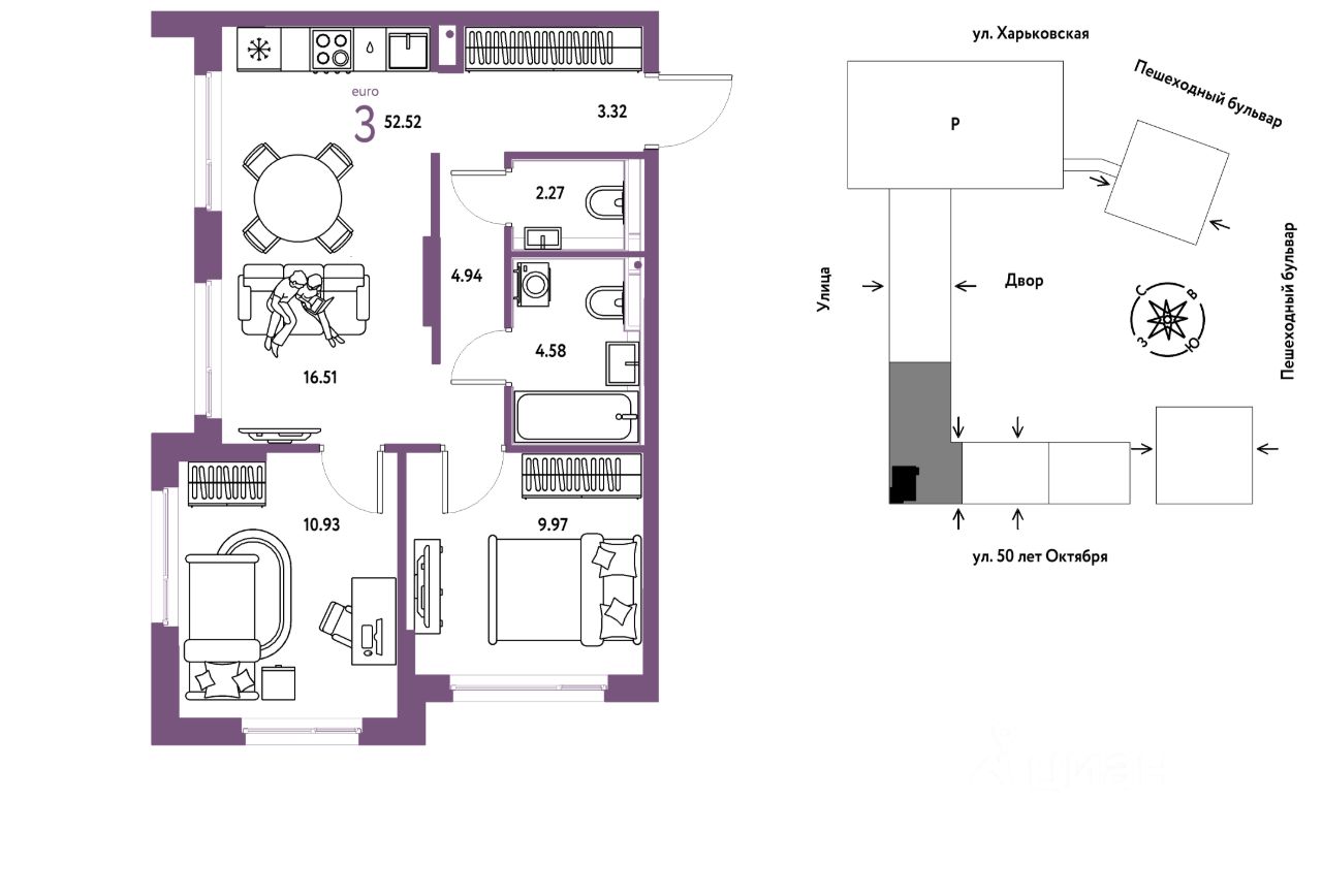 Продается 3комнатная квартира на 15 этаже от застройщика Страна Девелопмент. Площадь квартиры 52,52 кв. м.