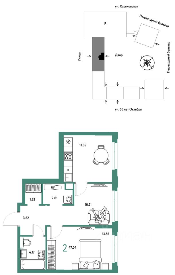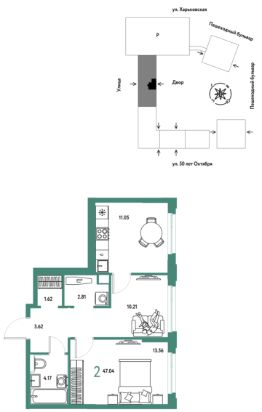 Продается 2комнатная квартира на 9 этаже от застройщика Страна Девелопмент. Площадь квартиры 47,04 кв. м.
