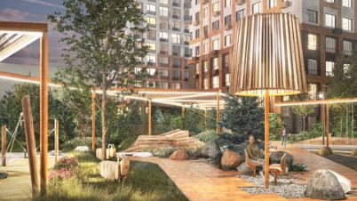 - Основная идея благоустройства дворов — создание камерного, уютного пространства. Периметры кварталов образуют закрытые контуры, внутри которых расположились тихие дворы с местами для отдыха, игровыми и релакс-зонами. Благодаря сквозным парадным во дворе нет машин. Защита от посторонних, служба охраны и видеонаблюдение 24/7 — гарантия безопасности вашей семьи.