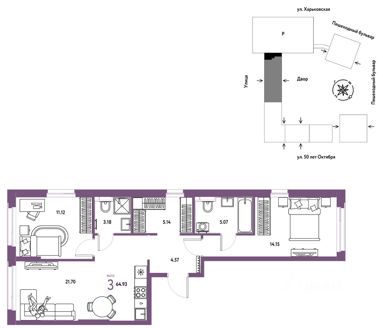 Продается 3комнатная квартира на 15 этаже от застройщика Страна Девелопмент. Площадь квартиры 64,93 кв. м.