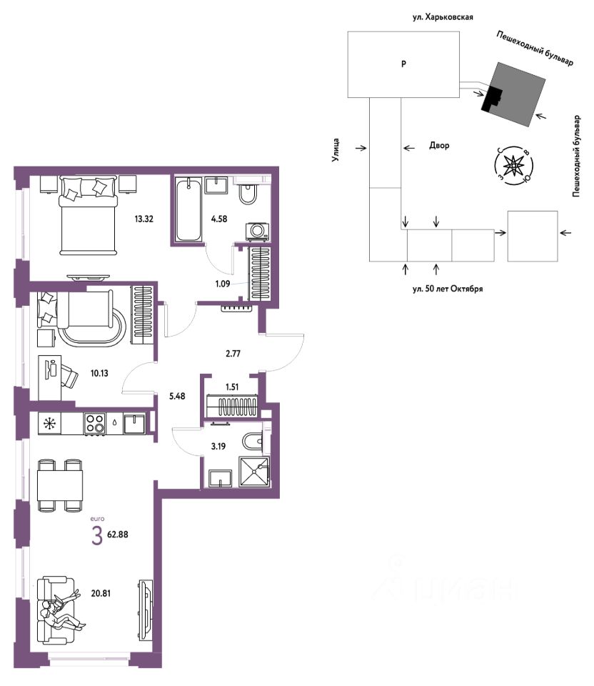 Продается 3комнатная квартира на 7 этаже от застройщика Страна Девелопмент. Площадь квартиры 62,88 кв. м.