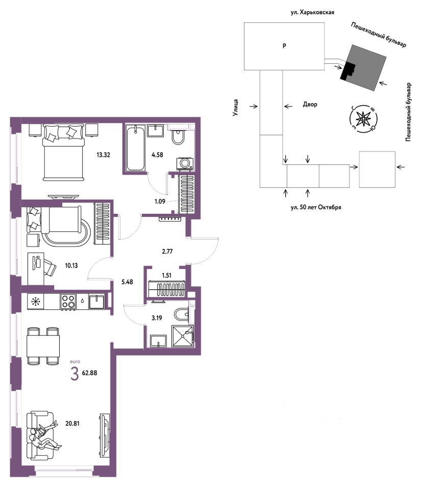 Продается 3комнатная квартира на 8 этаже от застройщика Страна Девелопмент. Площадь квартиры 62,88 кв. м.