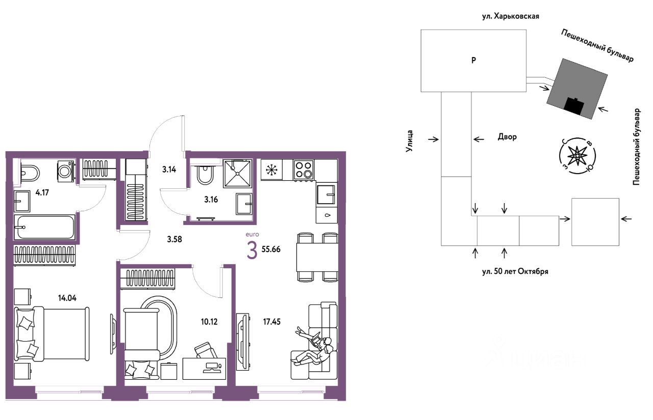 Продается 3комнатная квартира на 12 этаже от застройщика Страна Девелопмент. Площадь квартиры 55,66 кв. м.