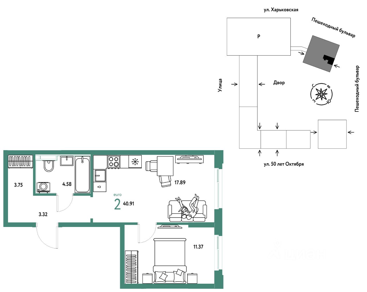 Продается 2комнатная квартира на 13 этаже от застройщика Страна Девелопмент. Площадь квартиры 40,91 кв. м.