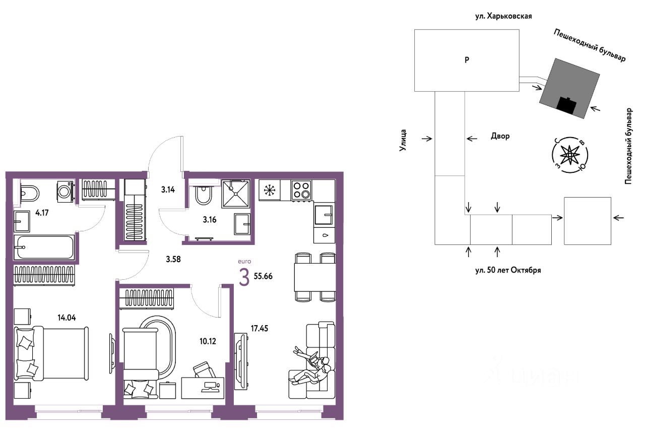 Продается 3комнатная квартира на 16 этаже от застройщика Страна Девелопмент. Площадь квартиры 55,66 кв. м.