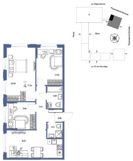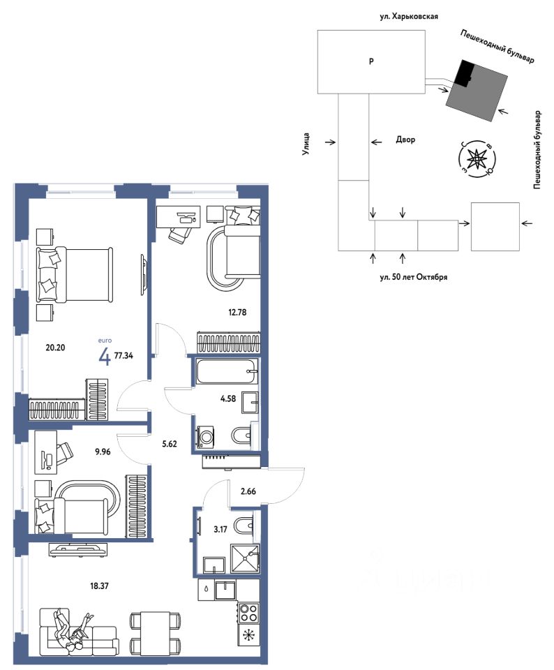 Продается 4комнатная квартира на 24 этаже от застройщика Страна Девелопмент. Площадь квартиры 77,34 кв. м.
