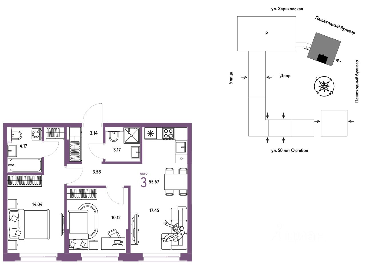 Продается 3комнатная квартира на 24 этаже от застройщика Страна Девелопмент. Площадь квартиры 55,67 кв. м.