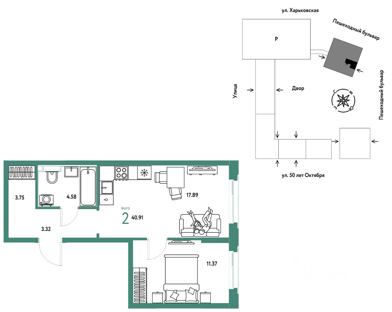Продается 2комнатная квартира на 24 этаже от застройщика Страна Девелопмент. Площадь квартиры 40,91 кв. м.