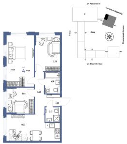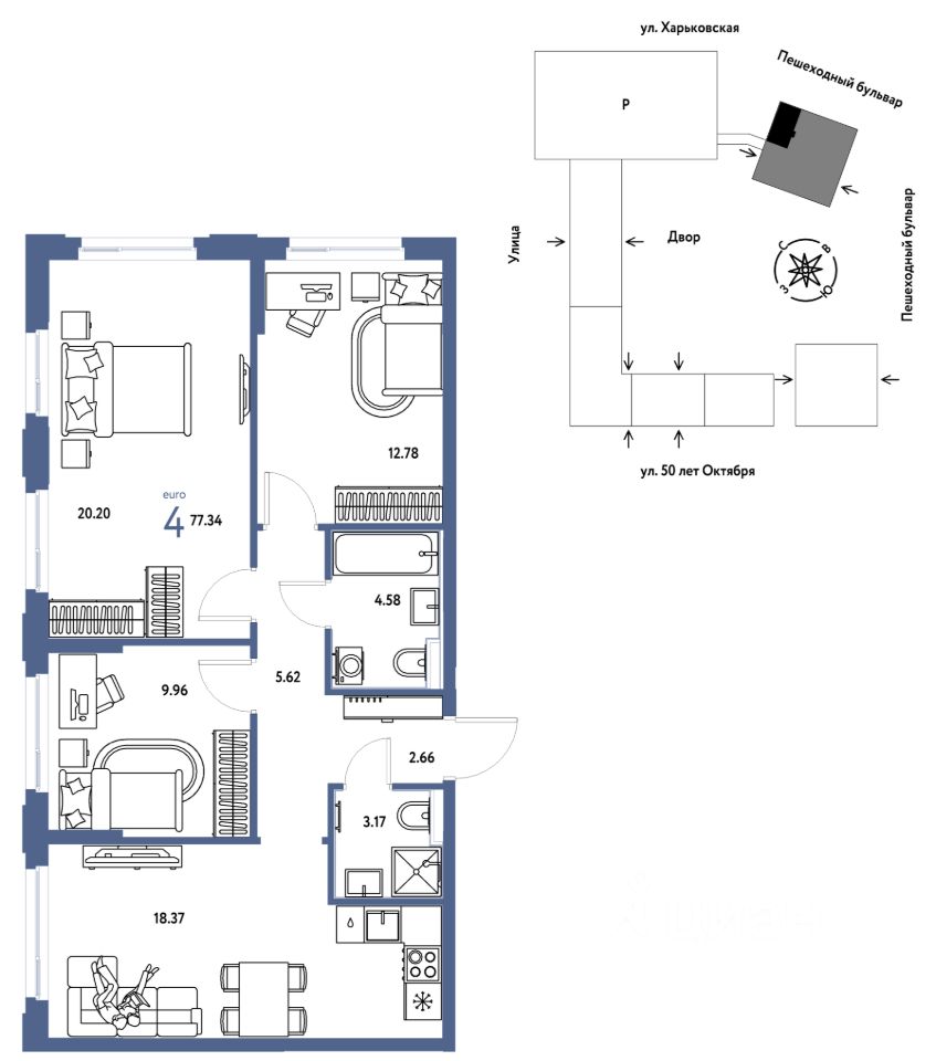 Продается 4комнатная квартира на 25 этаже от застройщика Страна Девелопмент. Площадь квартиры 77,34 кв. м.