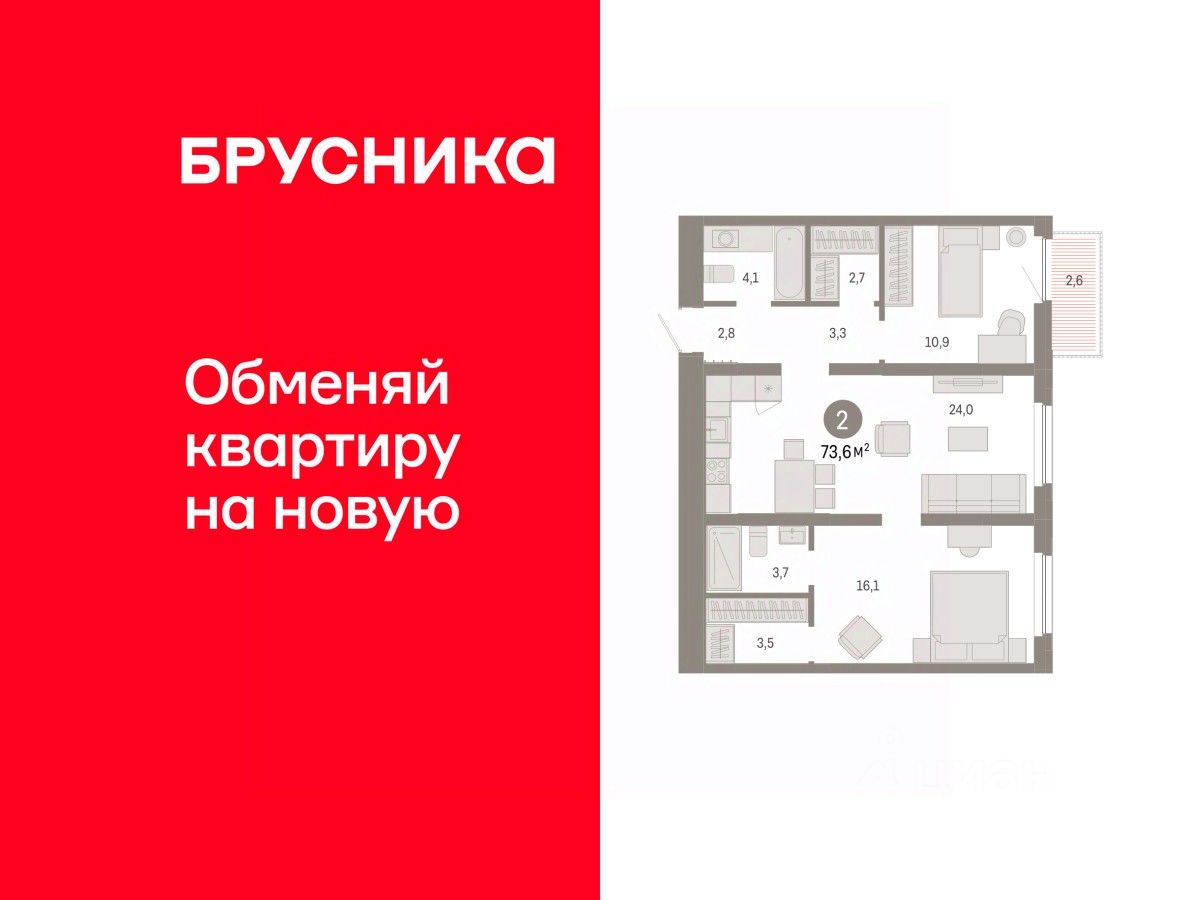 Квартира с кухней-гостиной и двумя спальнями в жилом районе "Зарека". Особенности планировки: балкон, предчистовая отделка, разнесённые спальни.