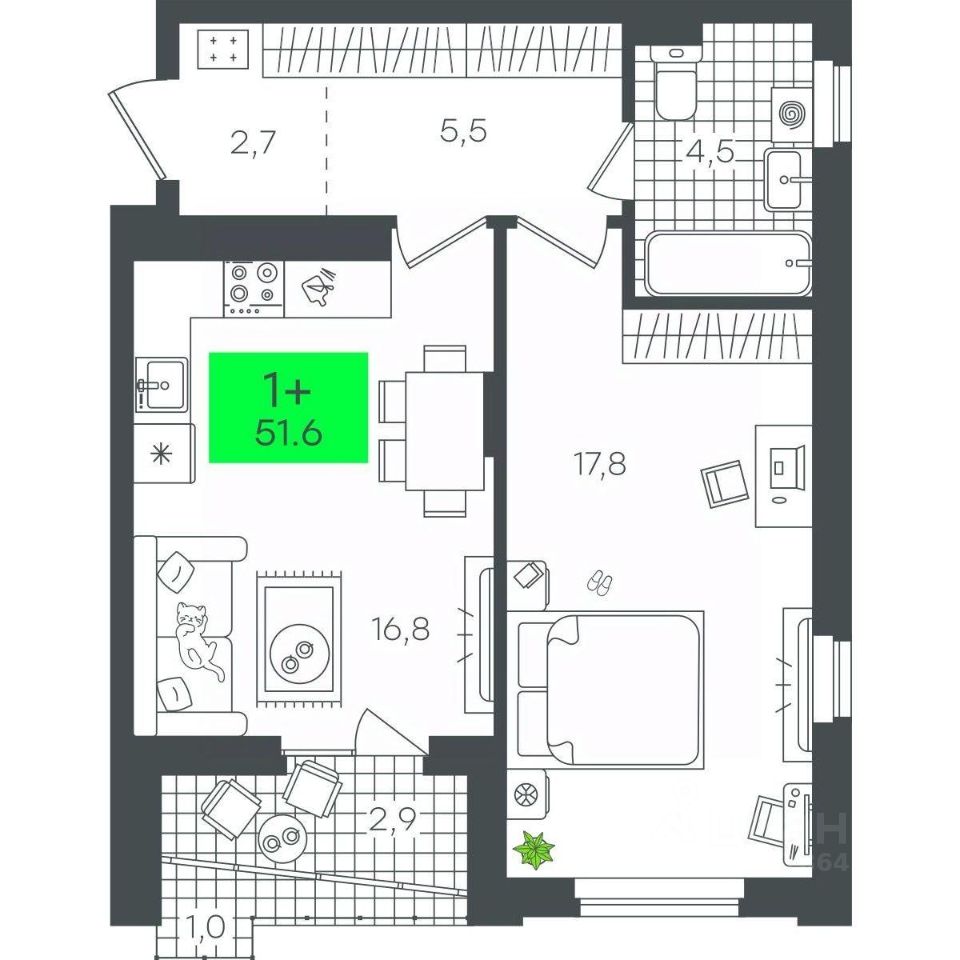 Продаётся 1-комнатная квартира в строящемся доме (Д5.2 (Малкова, 5)), срок сдачи: III-кв. 2026, общей площадью 51.6 кв.м., на 5 этаже. Компания 4D приступила к строительству нового жилого комплекса "Гранд квартал". Новый ЖК находится в зеленой зоне Калининского района, южнее микрорайона Тюменская слобода.