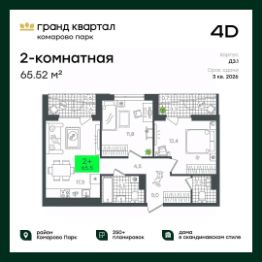 Продаётся 2-комнатная квартира в строящемся доме (1-Д3.1 (Глебова, 10)), срок сдачи: III-кв. 2026, общей площадью 65.52 кв.м., на 4 этаже. Компания 4D приступила к строительству нового жилого комплекса "Гранд квартал". Новый ЖК находится в зеленой зоне Калининского района, южнее микрорайона Тюменская слобода.