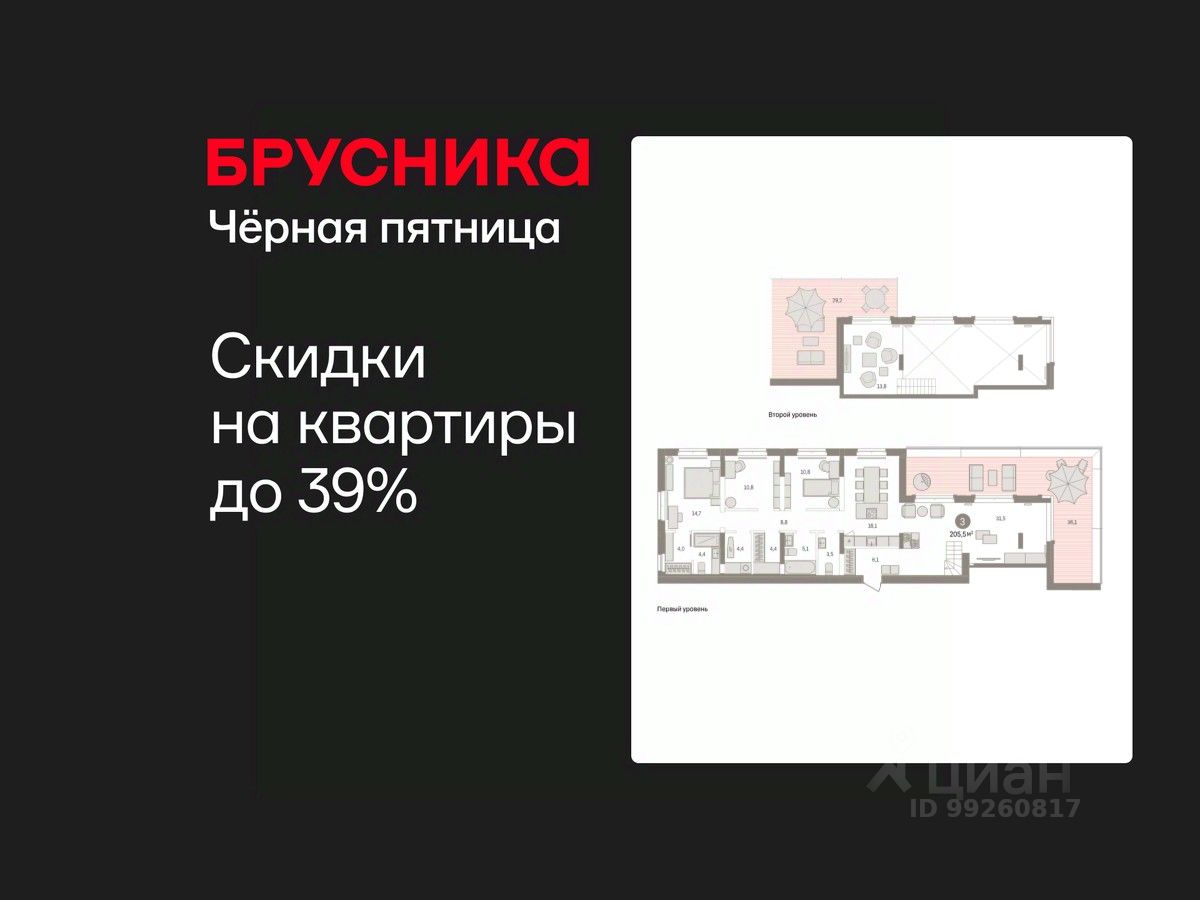 Двухуровневая квартира с кухней-гостиной и тремя спальнями в кварталах "На Минской". Особенности планировки: второй санузел, гардеробная, двухуровневая, предчистовая отделка, мастер-спальня, постирочная, терраса на крыше.