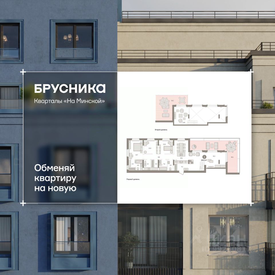 Двухуровневая квартира с кухней-гостиной и тремя спальнями в кварталах "На Минской". Особенности планировки: второй санузел, гардеробная, двухуровневая, мастер-спальня, постирочная, потолки 3 м и выше, предчистовая отделка, терраса на крыше.